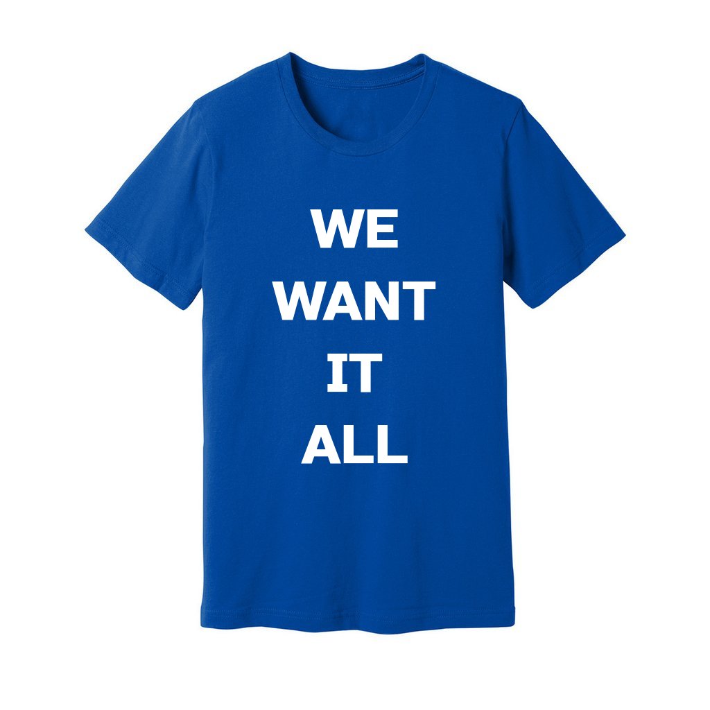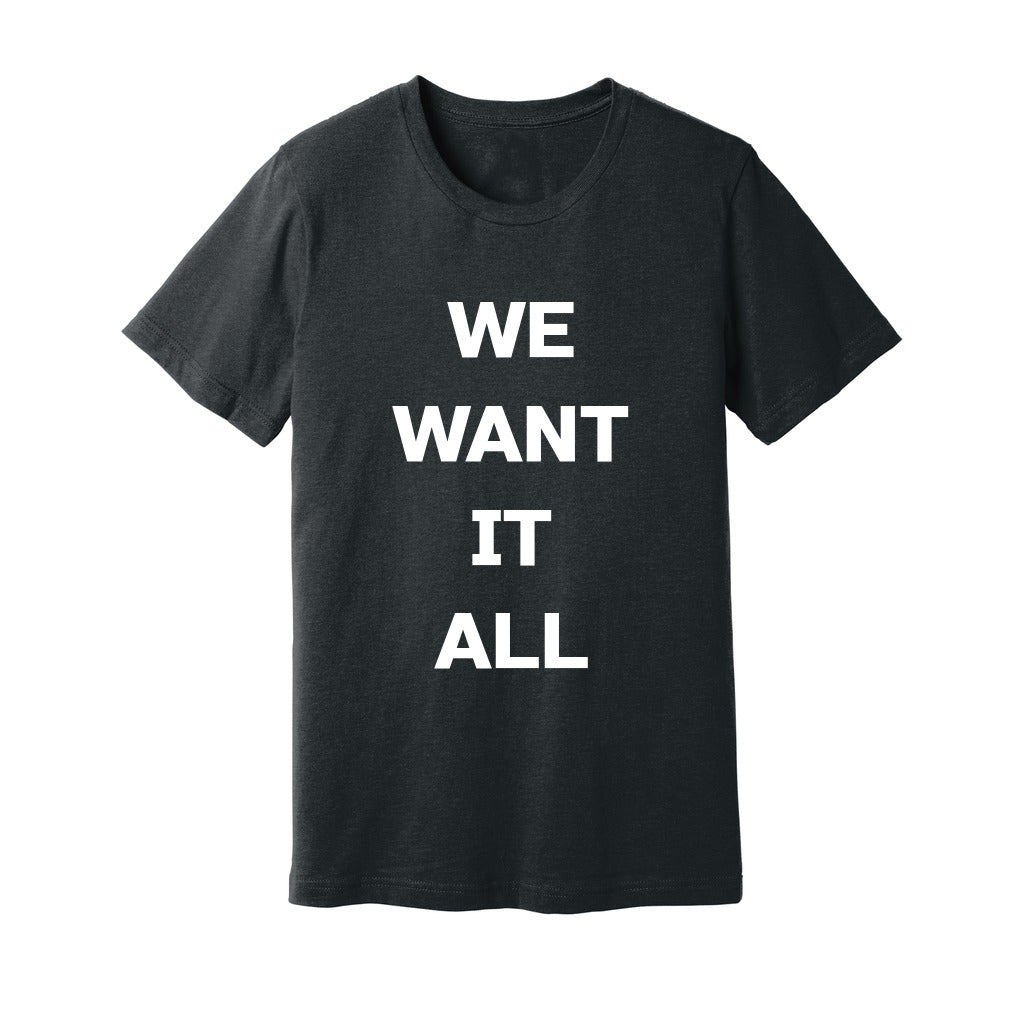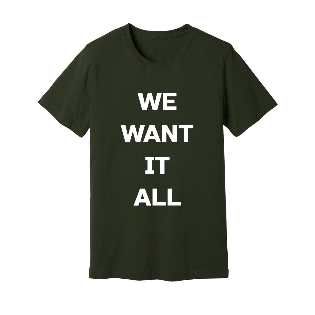 Embrace your desire for limitless possibilities with our "We Want It All" slogan t-shirt. This bold and empowering declaration captures the essence of your ambition and drive to conquer every opportunity that comes your way. Made from high-quality fabric, this comfortable t-shirt will be your go-to choice for expressing your determination and fearless spirit. Wear it proudly and inspire others to chase their dreams without holding back. Whether you're a go-getter, an adventurer, or a dreamer, this t-shirt will remind you that the world is yours for the taking. Get ready to seize it all and make a statement with our "We Want It All" t-shirt.